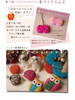 今週末は「ハルカスでつながろう!第3回 手づくりらんど」です 現在、最後の追い込みをしているはねつきりんごです いつもほどに盛りだくさんにはご用意しませんので、「これだけは欲しい!見たい!」など、ご要望がありましたら早めにコメント等でご連絡くださいね 羊毛フェルトを体験してみたい超初心者さん、ワークショップで触れてみませんか 当日会場にてお待ちしております さて、今回のメイン告知はここからです はねつきりんごのフェルト雑貨を置いていただいている中崎町のお店 Attic Days(アティックデイズ)さ...
