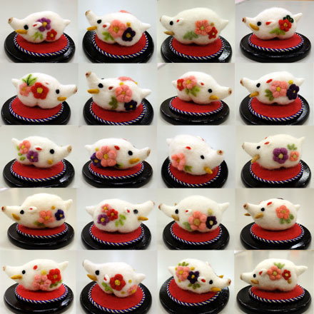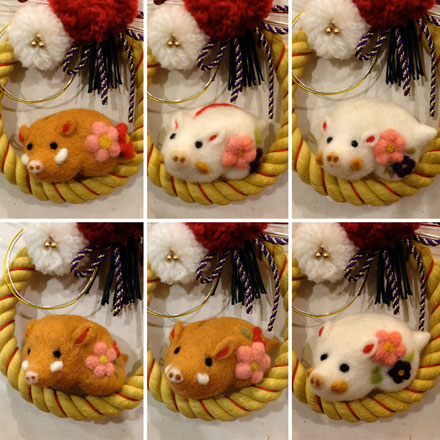 きのう、奈良登美ヶ丘産経学園での1DAYレッスンが無事終了いたしました! はねつきりんごと一緒にちくちくしてくださったみなさん、楽しい時間をありがとうございました! いのししの色を茶と白どちらか選べるようにしていたんですが、まさか、まさか、えっまさか?! ・・・で、なんと全員茶色を選択されましたー! ほんとにびっくりしました(^◇^) 見本の白いのししくんの顔がかわいらしすぎて白ブタちゃんっぽかったからかも(笑) なので一覧写真も全員茶色です! 白の羊毛...