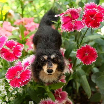 こんにちは! 梅雨入り前さいごの晴れ・・・ 外は暑いですが家の中は爽やか〜〜♪ 気持ちよ〜く、フェルトわんこのご紹介をしてまいります(*^^*) 撮影時は春。 花盛りのお庭でニコニコ笑顔をふりまいてくれているのはミニチュアダックスフンドのsweetyちゃん! オーダーは、先代わんこであるこのsweetyちゃんと、現役わんこのはなちゃんとの2匹分いただきました。 「2匹の体格や顔つきの差をしっかりつける」ということを念頭に制作させていた...
