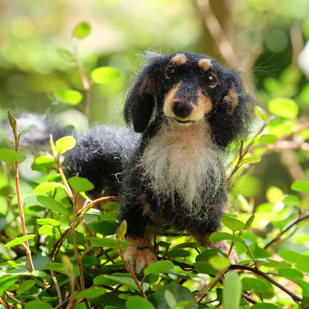 ブラックタンダックス先代・現役シスターズのsweety&はなちゃん、 今回は現役わんこはなちゃんのフェルトわんこのご紹介です! ご覧のとおりのスリム〜〜なはなちゃん♪ ポーズも高めのおすわりにしたので、よけいにすらりとみえます(^_-)-☆ 鼻面もsweetyちゃんと比べてぐっと細めです。 制作時には細い細いと言い聞かせすぎて、少し細くしすぎちゃったかも?なんて反省もしておりますが(笑) ...