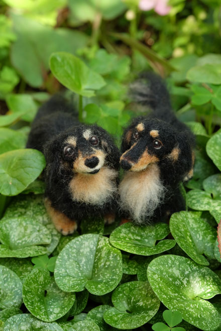 ブラックタンのミニチュアダックスフンドシスターズ、先代わんこのsweetyちゃんと現役わんこのはなちゃん。 先代sweetyちゃんが天国に行ったあとにはなちゃんがきたので実際には一緒にいたことはなかったのでした。 今回2匹一緒にオーダーしてくださったので、現実には見られなかった夢のツーショットを 小さなフェルトわんこでかなえられました(*^▽^*) ステキなファンタジー、みなさま一緒にお楽しみください♪♪ かたばみの森で一緒にかくれんぼ♪ ...
