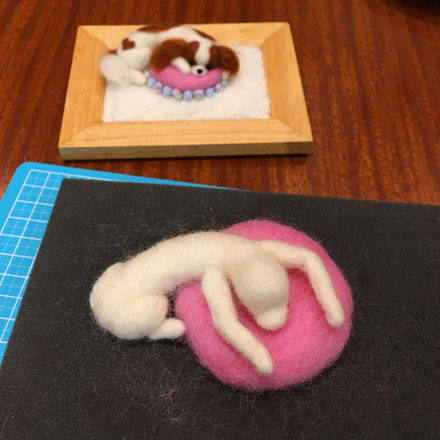 こんにちは! 無事にてづバ出店を終え、ひと息ついているはねつきりんごです 直前には講習が2つとも重なるというとてもとてもハードな週でしたが、出店まではなんとか持ちこたえられてよかったです。お待たせしているオーダーわんこも早くお届けしたいし、まだまだ倒れるわけにはいきません と、気合いが入っているうちに、講習のご報告もしておきまーす! まずは産経学園羊毛フェルト講座から 2月からの2ヶ月間でつくっていたクッションでまどろむキャバリアちゃん...