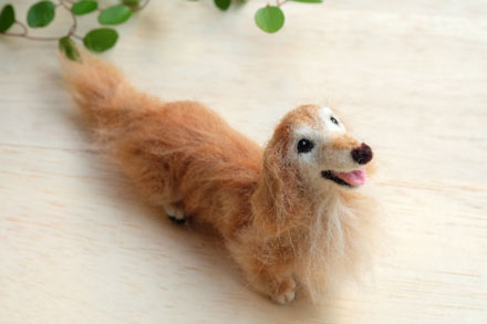 今回もオーダーわんこのご紹介。 ミニチュアダックスフンドのマフィくん 優しい笑顔が印象的なわんこです マフィくんが亡くなったその日にオーダーのご相談をしてくださり、やりとりのお言葉は少なくても深い悲しみの中におられることはよくわかりました。 そんなお気持ちもたっぷりつめこんで、優しくも元気なマフィくんの姿を小さく再現させていただきました。 遺毛も使わせていただいています。 長めの毛は耳の飾り毛に、そしてブラッシ...