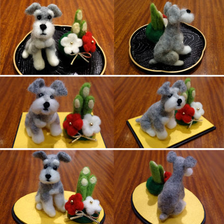 今年さいごの産経学園羊毛フェルト講座、無事に終了いたしました! お顔の仕上げを残すのみとなっていたシュナウザーくん、2時間近くかけてお顔をつけ全体の修正や仕上げをしました。 門松飾りもつくって、完成した干支飾りセットがこちらーーーっ めちゃくちゃかわいいーー 上の2匹は、それぞれご自身でご用意してくださった飾り台にのせて お顔も体型もちょっとずつ違う・・・3匹それぞれがとってもチャーミングで、文句のつけようがありません これが初めての羊...