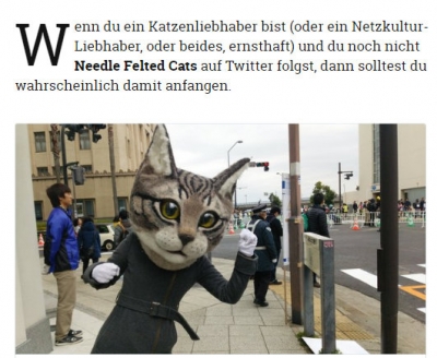 JUGEMテーマ:羊毛フェルト ドイツ語のサイトでリアル猫ヘッドの記事がまとめられているよとFB友人の方が教えてくれました。 海外の人の反応が見れるって面白いですね。 http://www.bento.de/haha/in-japan-basteln-sich-menschen-riesige-katzenkoepfe-542837/