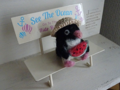 JUGEMテーマ:羊毛フェルト なんだそりゃーなタイトルですが こういうことです。 予想以上にとぼけた仕上がりになった ペンギンさん。 レース糸のカンカン帽がポイントです。 こちらは先日のプチマルシェで お買い上げいただきました。