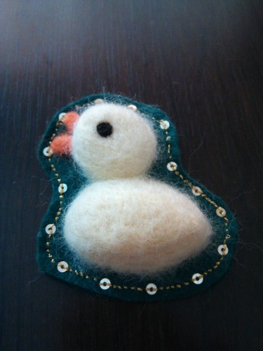 JUGEMテーマ:羊毛フェルト 羊毛フェルトでヒヨコちゃんブローチを作ってみました。 今回もイメージを絵にして作っていったのですが、 うさぎさんの時よりはイメージに近づけたのではないかと思っています。 ふちに金色のスパンコールと糸を縫いつけてみました。