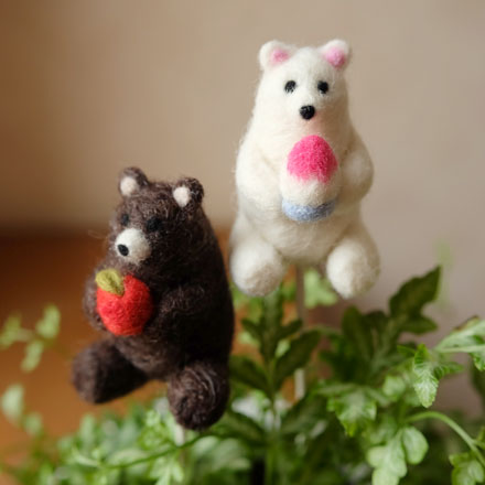 昨年までは夏期(7月・8月)は夏だし羊毛さわるの暑いかな〜・・・と、講習をお休みさせていただいていたのですが、今年は夏も続けて開講させていただきます 涼しい店内でなら、羊毛も暑くないとは思いますが、アイテム的には暑苦しくないものを! ということで、しろくまモチーフに決定 身に着けるものではなく、ガーデンピックにしましたので、お持ち帰りになってすぐ使っていただけますよ 「おすわりくまさんのガーデンピック」 しろくまさんだけではちょっとさみしかったので、茶色の森のくまさんも...