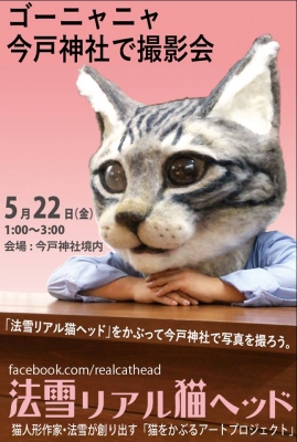 JUGEMテーマ:羊毛フェルト詳細が決定したので更新しました。5/19更新●GO にゃーにゃー! 5月22日「あの日猫になれなかった片思いの猫好き達へ」4月の東京都美術館で猫になることの出来なかった猫好きの皆さん!5月に再びリアル猫ヘッドを使って猫を被るチャンスが訪れます。場所は浅草、今戸神社。縁結びの神社としても有名であり招き猫発祥の地でもある今戸神社。日本古来からのパワー渦巻く聖域に「法雪リアル猫ヘッド」アートプロジェクトがシンクロします。猫ヘッドが増えたので友人と一緒に撮ることも可能です^^こ...