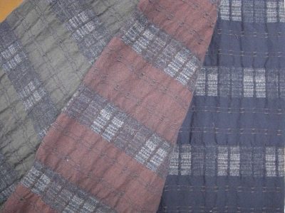JUGEMテーマ:生地色々 続いては、廃番間近のこちら少し白飛びしています 左からNo.7547 c/#1,2,3 (綿62% 毛38%) ウールトップのドビーになっていて、 刺し子ステッチ部分もあります 現在庫は、 c/#1 20.5mのみ c/#2 2反(50mくらい) c/#3 0.5反(13mくらい) となっております こちらはリピートしません 本当にもうごくわずかで終了なのでお早めに〜 左からNo.7542 c/#1,2 (綿70% 毛30%) 綿がベース生地で、ウールで格子柄にしていま...