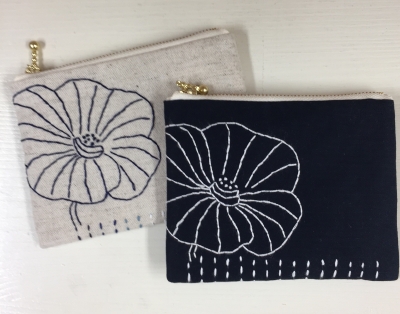 JUGEMテーマ:刺し子 シックなアネモネ柄が仲間入り 可愛い物や色々あります。 ポーチの中は仕切りひとつあり