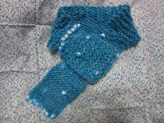 青い空色のマフラー11/22に完成しました。 ぽんぽんつけるの初めてでちょっと大変でした。感激。 両面テープをつかえばいいとか裏技とか知りました。 私は、使わないほうが向いてました。 つけてみるとこんな感じです。 マフラーつけてどこ行こうかな。 あったかいです。