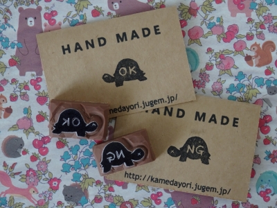 JUGEMテーマ:消しゴムはんこ OKにゃんことNGにゃんこに続いて、 OKかめさんとNGかめさん。 にっこり顔としょんぼり顔です。 こちらは前に自分用に作った 「済」の文字入り。 便利だったので販売用に追加しました。 先日のイベントから お目見えしています。