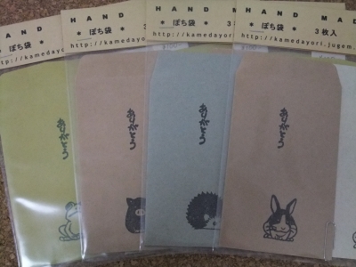 JUGEMテーマ:消しゴムはんこ 3cm角のどうぶつはんこの図案の中で 「かしこまって見えなくもないシリーズ」と 呼んでいるものがありまして、 そんな図案を使って 先日のイベントからぽち袋を出品しております。 かえる、ぶた、はりねずみ、うさぎ。 同じ図案に ありがとう、の文字と ほんのきもち または よろしくお願いします、の文字を入れたもの、 それから自分で用途を決められるように文字なしのものの 計3枚入り。 以前作ったThank youシールも 試しに出してみたら意外と好評で、 ぽち袋ともども ...