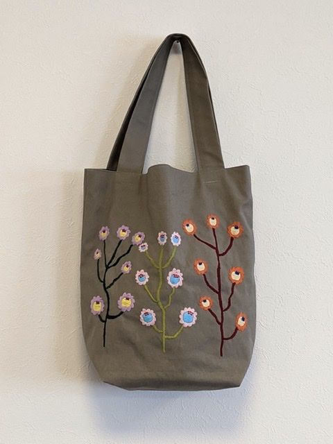 ユウタさんの、デージーの花をイメージした刺繍バッグです。 落ち着いた雰囲気ながら、可愛らしい色使いの刺繍です。