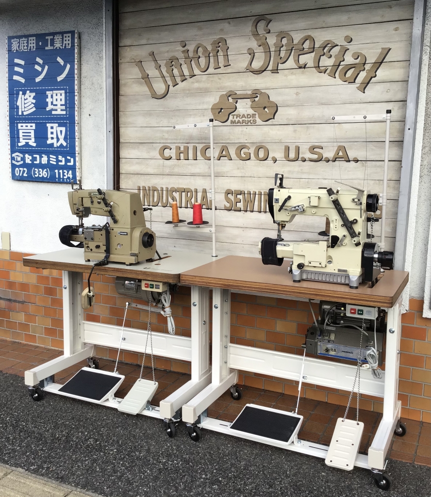 裾上げ専用ミシン 1本針 二重環(2本糸のチェーンステッチ) 工業用 中古 整備済み ミシン 売約済み (左側) ヘビーオンスのジーンズ用 (右側) ストレッチ素材のパンツ用 2台まとめてお買い上げ頂きました。 ありがとうございました。 JUGEMテーマ:手作り/ハンドメイド雑貨