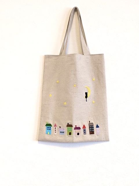 リナさんのおうちや黒猫の刺繍です。 裏面の夜空を眺めているような黒猫ちゃんも印象的です。 細かな刺繍が得意で、なんでもイラストをそのまま刺繍してくれます。 こちらも、コルメナアート展で展示いたします!