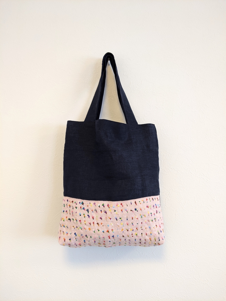 エリコさんの独特な刺し子のバッグです。 筆で絵具をポンとおいたような素朴な点をイメージした刺し子です。 リネンの風合いと相性が良いですね。