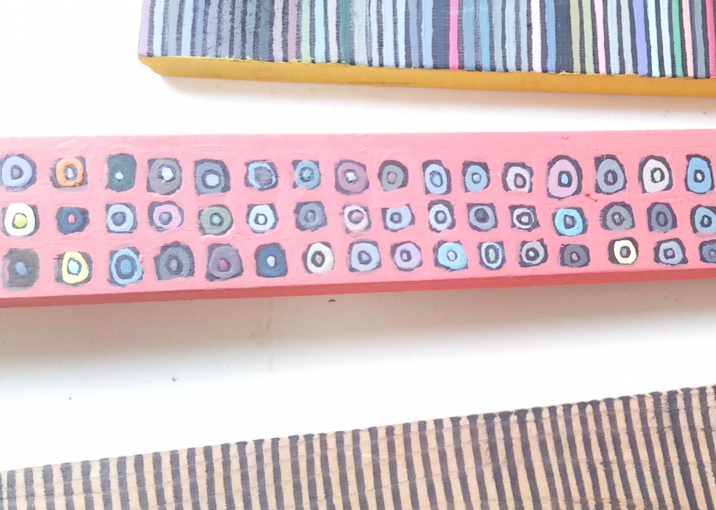 さまざまな色の絵具で木の棒をカラフルにしているのは、リョウマさん。 今日は、リョウマさん定番のボーダーを描いています。6年間同じ柄を描き続けています。 最近では、丸い卵のようなものモチーフを描くこともあります。 これからまた新しい模様も出てくるかも、、、 作業場もカラフル。 小さいテーブルから少しづつだけど作品が生まれています。 このカラフルな木の棒が一体どうなるのか、できあがりが楽しみです。。