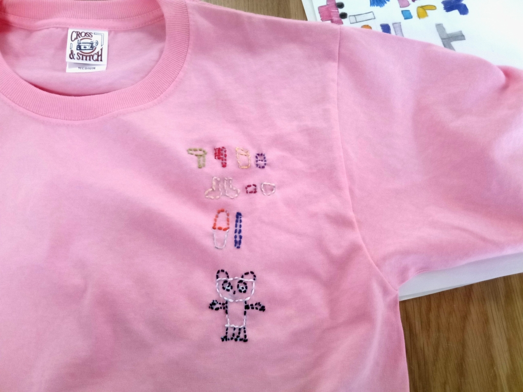 ミホさんの刺し子。 Tシャツにパンダやドライヤー、化粧水、靴下、歯ブラシなどなど! かわいいアイテムがたくさん広がっています。 元のデザインは、ミホさん本人が描いた色鉛筆画です。 まだまだ、いろんな刺し子な出来そうですね。