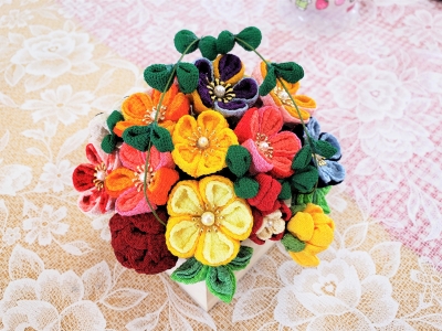 次回のつまみ細工教室は、4月21日を予定しておりましたが、 4月中のサロンの全講座がお休みすることになりました。 早く事態が収束し、またみなさまと楽しく講座が開けることを願っています。 さて、生徒さんの作品のご紹介です。 3月に途中まで作ったフラワーボックスを、ご自宅でこのように仕上げて下さいました。^^ お花をされている方なので、アレンジメントもとっても素敵で...