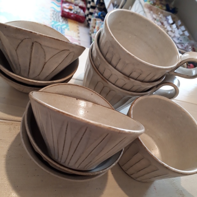 JUGEMテーマ:和食器通販 JUGEMテーマ:手作り/ハンドメイド雑貨 こんにちは(*^^*) めちゃくちゃ天気いいですね〜☆ 洗濯日和 今日は、久々に陶器作家のらくどさんが新作を納品してくれましたよ〜 スープマグカップ スタッキング出来るようになってて、サイズ感ばっちり! お皿も葉っぱ模様に削ってくれてて、おしゃれ〜 陶灯も、土台が付いてバージョンアップ 見にきてね〜(*^^*)