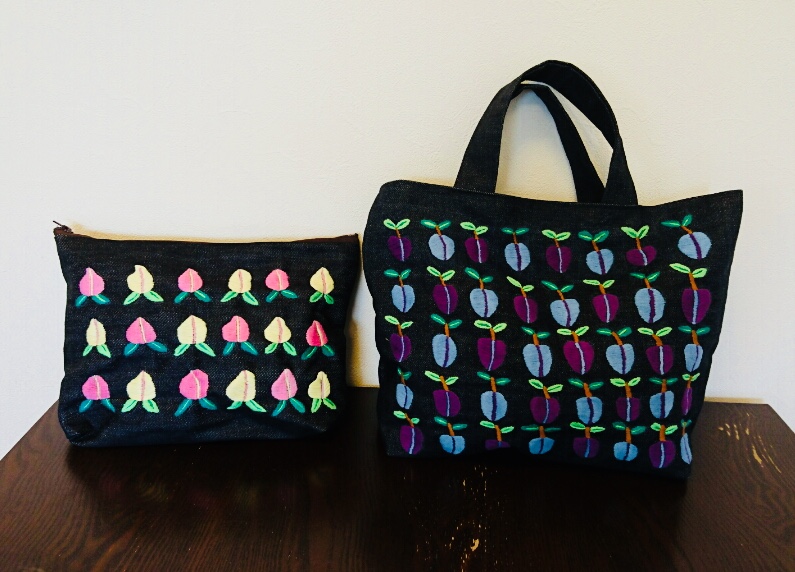ユウタさんの桃のポーチとすもものバッグです。 ジーンズに可愛い果物の刺繍がイイですね。 ロジックに納品の予定です。