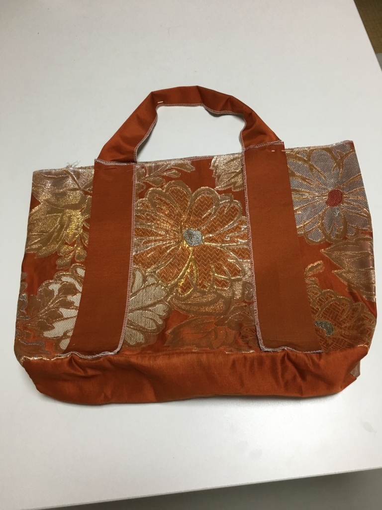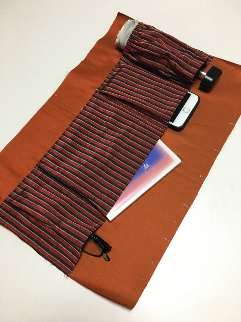 完成形から逆に手順を考えてるところです。 内布には、帯の裏生地を使います。 残った帯の裏生地は端切れなので、ポケットには手持ちの縞柄地を使ってみました。 内袋の片側にポケットを作りました。 折りたたみ傘(ペットボトル、薄手のショール等)が縦におさまるように、ゴム入りです。 スマートホンと文庫本やメガネの所は全部タック付きで余裕が有ります。 テープ状のデザインを表に縫い付け、延長...