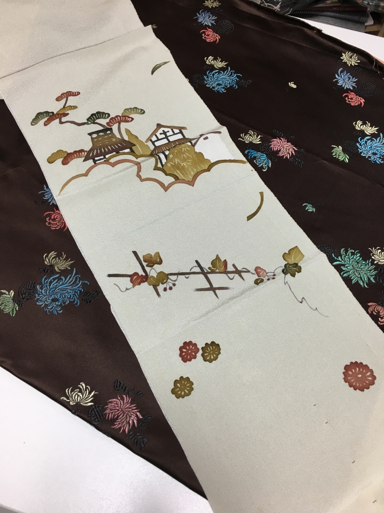 引き続き、もう一つの帯地でクラッチバッグを作ろうと思ってます。 その前に気分転換・・・お預かりしてる端切れで作る『巾着袋』の検討をしました。 幅19cm、長さが136cmの端切れ・・・衿のところかしら? 染めの柄を生かし、17cm×20cm位の巾着を二つ作ろうと思います。 ↓こちらは片袖分(約37cm×約100cm)の生地、右下に袖の丸みの跡があります。 参考にお預かりしてるのと同じサイズ(28,5cm&ti...