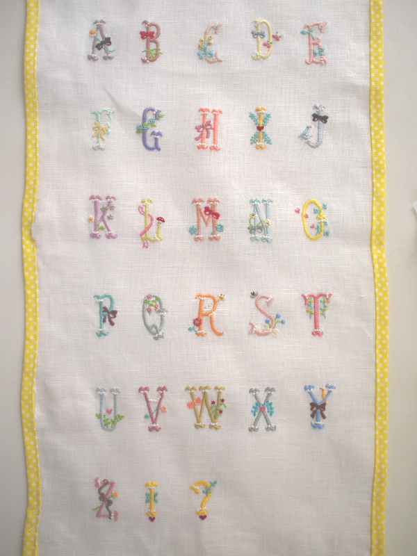 朝起きてから夜寝るまでを刺繍で描きました。 ルシアンさまの2014年のカタログ表紙としてお作りした作品で、モチーフは多いけれど細かすぎず、刺しがいがあるけど難しすぎないと思います。 もう作品が手元にないのもあって不鮮明な写真しかないのが申し訳ないのですが、色合いの見本などになさってください ^^ 実物はすべて違う色でアルファベットを刺繍しています。 でも、全体のバランスを考えて色を26色選ぶのはそれだけでも大変なので、10色前後にしぼって26文字を交互に刺繍するとか、思い切って3色にすると...