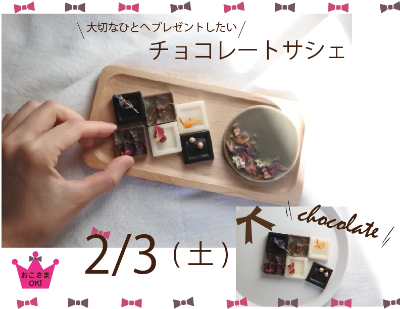 チョコレートサシェ・ワークショップ 2月、バレンタインの季節 サシェもチョコレート風で! 今回のチョコサシェはさらに進化して クランチチョコ風、ホワイトチョコ。。など ミニサイズを12個作れますのでいろんな飾り付けを試してみてくださいね かわいいのがいっぱいできたらお友だちに、大切なひとにプレゼントしてみませんか (チョコそっくりですが、食べられませんのでプレゼントの際にはご注意ください!) ...
