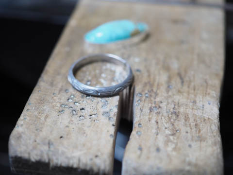 JUGEMテーマ:天然石・原石・ルース ナンバーエイト ターコイズのリング制作です。 アームをシングルで、唐草模様(アラベスク模様)を周囲に。 大き目のターコイズなので、タテ位置でガツン!と目立つデザインにしました。 このデザイン自体は、古典的なもので、シャカ玉2個をリングに取り付けます。 石留め、サイズ確認 14号です。 シンプルで、ターコイズが主役のリング。きれいなブルーがとてもこの季節に合うと思い...