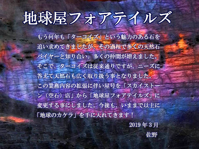 JUGEMテーマ:天然石・原石・ルース 先日よりの案件ですが、「特許庁」へ登録申請しております屋号に関して。 業務内容の拡張に伴い、屋号(店名)を「スカイストーン(空石)店」から「地球屋フォアテイルズ」に変更いたします。(年内) 既に、特許庁にて商標登録中(申請済)です。登録には数か月を要するということですが、山田特許事務局から使用を始めても問題が無いというご連絡をいただきましたので、新元号にあわせて4月あたりからこの屋号で本格的に稼働する予定です。 ...
