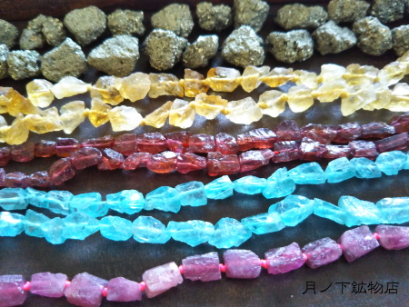 近々、鉱物原石ビーズ入荷します。 上からパイライト、シトリン、ガーネット、アパタイト、ピンクトルマリンです。 原石そのままをビーズに加工した商品です。 大きさはそろえてありますが、ひとつずつ形が違います(*^_^*) アップまでもう少々お待ちくださいませ。 月ノ下鉱物店 JUGEMテーマ:天然石・原石・ルース