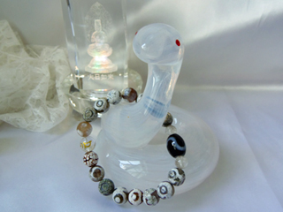 JUGEMテーマ:天然石・原石・ルース 私のところの赤い眼をした白蛇さんです。 ガラス製ですが、愛嬌のある顔が可愛いです。 本日こちらの白蛇天珠と火供三眼天珠のブレスが 商談成立で、ビールで乾杯しなくっちゃ~っと思っております。 生まれ年の干支をお客様にお聞きしたら、ヘビ年かなと思っていたら 申年ということで、大日如来の梵字バンなのだとか・・ 巳年の守護尊は、普賢菩薩のアン・・・なのですが、 取り急ぎバンに差し替えました。 まだできたてなので、少しゴムの連結がいびつですけど、 発送はまだ余裕...