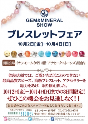JUGEMテーマ:天然石・原石・ルース JUGEMテーマ:おしゃれアクセ&雑貨S/SJUGEMテーマ:天然石アクセサリー イオンモール和歌山 〜ブログ更新中〜 ゜+。。☆。。★。。☆。。★。。☆。。★。。☆。。+゜こんにちは、本日2回目の更新ですちょっと耳よりなお知らせです☆アナヒータストーンズ伊丹店でブレスフェアが開催されますよっ開催日:10/2(金)〜10/4(日)場所:アナヒータストーンズ イオンモール伊丹店期間中は、普段店頭ではご覧頂くことのできない高品質のビーズ、高級ブレスレット、アクセサ...