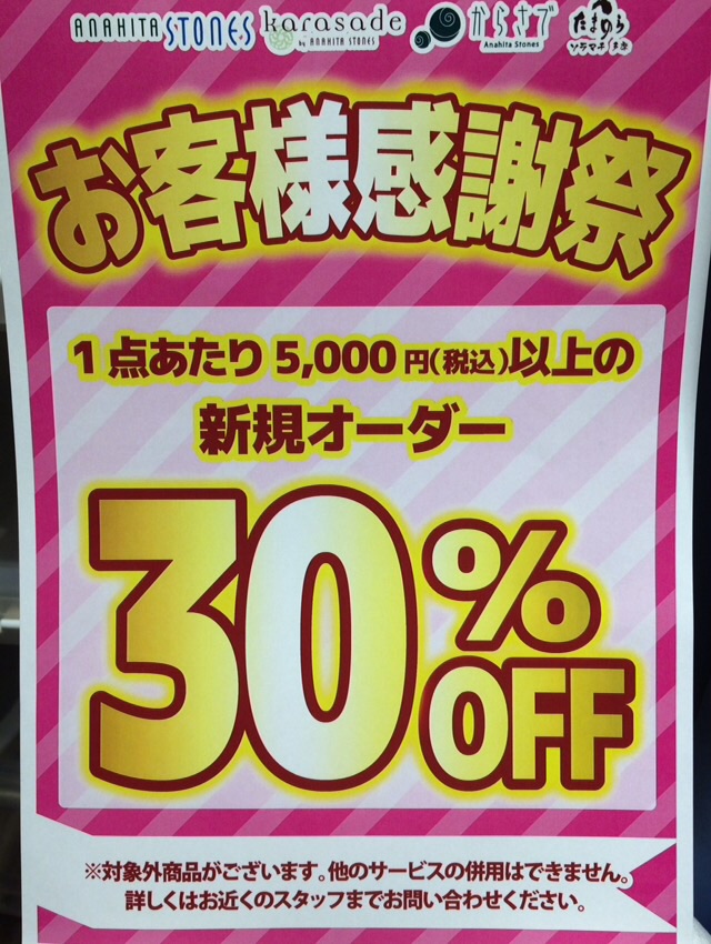 JUGEMテーマ:天然石・原石・ルースおはようございます昨日のブログにも告知していましたが、本日7月11日・明日12日の土日限定、岡崎店限定のセールを開催いたします店内商品、合計税込5,000円以上で30%OFF!!ショーケース内の高級ブレスや新入荷の原石やブレス、雑貨類も対象ですなんとなんとブランドシルバーもた対象です(対象外・・・勾玉、天珠、ビーズ単品、ハンドメイドレザーブレス、ギフトBOX)もちろん、オーダーのこちらのセールも開催中です大変お得な2日間に是非ご来店くださーーいスタッフ一同元気にお待...