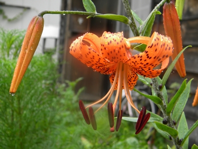雨の朝、百合が咲きました。 オレンジの地に茶色の斑点。 下向きに咲いて、 茎にはムカゴ。 これらの特徴はオニユリだそう。 ちなみに 隣の家の百合はこんな。 上向きに咲いて 斑点無し、 雄蕊雌蕊の色も違う。 茎のうーーーーんと下まで行かないと葉っぱは無い。 なんていう名前のユリか、こちらはわからない、 とりあえずよそのお宅のユリなので 調べるの後回し。 JUG...