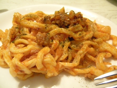パン・ピザ・ピザ・パン・ピザ・うどん・・・ に加わっての、 手作りパスタです。 相変わらずの、「お金がないので買い物に行かない暮らし」継続中でして、 悩んだ末の 手作りパスタ。 パスタの粉はデュラムで、 ひき方はセモリナでなければいけない、というイタリアの法律は、 乾麺に限るそうで、 生パスタはどんな粉を使っても良いのだそうです。 真偽のほどはおいといて、 北海道産の強力粉と、 フランス産の準強力粉をブレンドして パスタ生地を作りました。 細く切るところ...