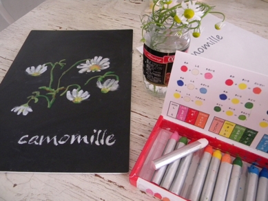 キットパスアート「カモミール」 先日インストラクター認定をいただいたキットパスアート。 リバーシブルパネルA4に16色のキットパスで 庭に咲いたカモミールの花を描きました。 難しそうなレタリング文字は、今回キッチンから割りばしに登場いただいて 難なくできましたよ!(^^)!我ながら名案だ!とにっこりしちゃいました。 きっと誰でもやってるんだろうなあ、って後でクシュンとしましたが。 飾るとこんな♪ キットパスの良いところは、 ボードに描いても下絵...