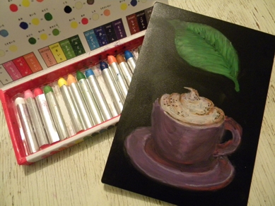 チョークアートのHow to本を買いまして、 描き方のページを参考に、 キットパス16色とリバーシブルボード(黒A6サイズ)で 「葉っぱ」と「カプチーノ」を描きました。 参考にした本は 佐藤真理著「夢いろチョークアート」。 この本の描き方で使用しているのは オイルパステル「モニークオリジナルチョーク29色」と ブラックボード。 対する キットパスは16色。。。。。 29色あるものとしての描き方ステップに...