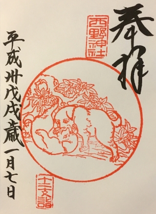 JUGEMテーマ:御朱印収集 こんにちは! 昨日は我が家の毎年の恒例行事、西野神社へ参拝にいってまいりました。目的はその年の干支の御朱印を頂戴するのと、左馬のお守りを購入することです。今年は戌年、【戌】の御朱印です。 この御朱印は開運招福縁起十二支朱印といいまして、毎年お正月の時期にその年の干支の御朱印を頂ける他、毎月朔日にも各干支の御朱印を頂くことができます。平成17年に創祀120年を記念し、拝殿に干支の木彫りを設けた際にその記念として作...