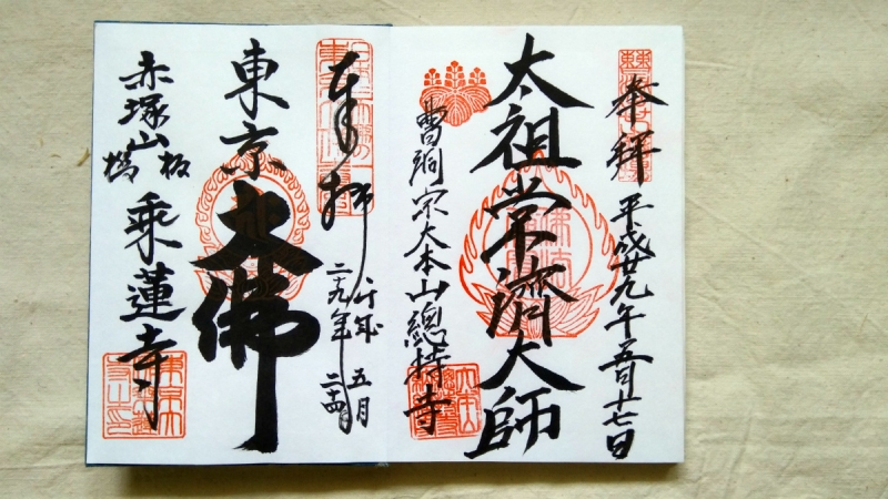今回はサクッと更新。 左は東京都乗蓮寺、右が横浜總持寺。 乗蓮寺は東京大仏が有名です。 日本で奈良、鎌倉につぎ3番目(もろもろ条件はありらしい笑)に大きい大仏。 正直、奈良、鎌倉の大仏を見てからだと落差が大きいのですが、それでも十分立派!!でした。 普段は書き置きか預けないと御朱印いただけないようなのですが、たまたま書き手さんがいらっしゃたので、特別に当日いただけました。 横浜の總持寺は、、、写真がない、、、。 ...