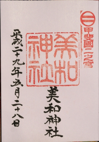 JUGEMテーマ:御朱印収集 山梨県 美和神社に参拝しました。 甲斐国の二之宮でもあります。 社務所に人が不在だったので、電話で連絡をして御朱印を頂きました。 私が参拝した際はすぐに来ていただけました。 拝殿の右側に連絡先が書いてありました。 甲斐国一宮の浅間神社の御朱印はコチラです。 http://gosyuin.me/?eid=19 甲斐国三ノ宮の玉諸神社の御朱印はコチラです。 ...