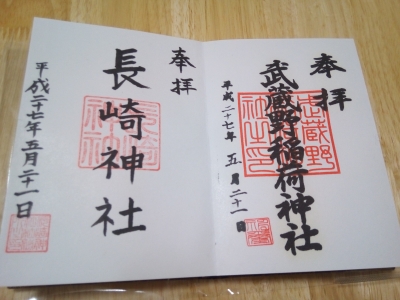 JUGEMテーマ:御朱印収集 大阪仏具店御朱印帳23・22ページ 武蔵野稲荷神社は練馬区江古田にあります。中野区にも江古田があって 中野区の江古田と練馬区の江古田は結構近いです。御朱印は随分と達筆 だなと思ったら日付以外は全部印を押してありました。。 長崎神社は前ページの豊島★金剛院と神仏分離したので近くにあります。 御朱印を書いてもらった後にお子さんなど御家族に見送ってもらいました。