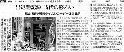 先日より展示しておりますタイムレコーダーの紹介記事を、 本日付け朝日新聞朝刊備後版に掲載いただきました。 朝日新聞備後版の販売地域にお住まいのみなさまは、どうぞ本紙29面をご覧ください。