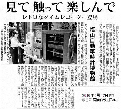本日付け毎日新聞朝刊備後版に、 タイムレコーダー展示の紹介記事を掲載いただきました。 毎日新聞備後版の販売地域にお住まいの方は、 どうぞ本紙24面をご覧ください。