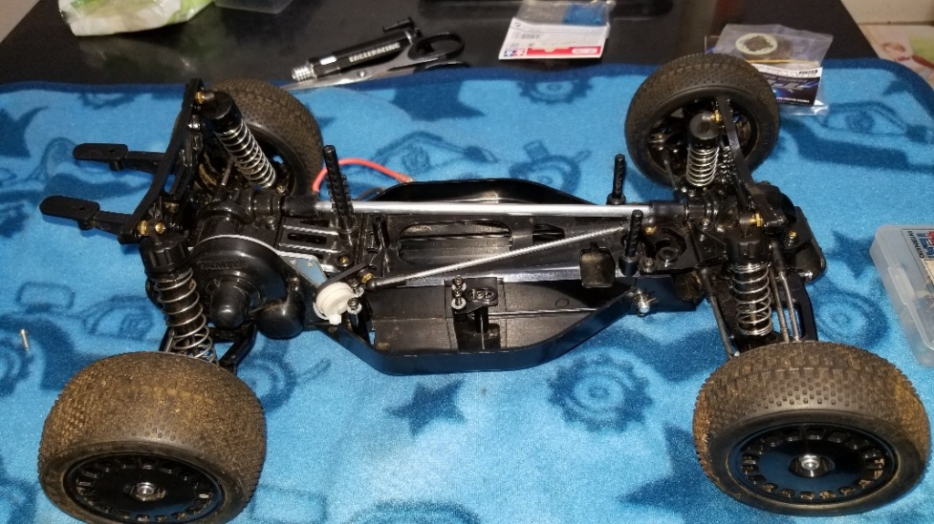 某オークションで落としたDF-03。 安いと思ったけど送料1,000円以上、ボディー無しなので新たに購入となるとそれほど安くはないと気づきました。 上手なオークションの利用の仕方は、フルオプションで工具とかバッテリーとかいらない物てんこ盛りがよいのではないでしょうかね。 まあ、程度はとてもよいのでよしとしましょう。 購入した理由は、バンブーサーキットにお邪魔したときに4WDのオフロードが1台あってもよいかと思ったからです。 でも、今のところ本格的にやることはなさそうなので、最低限のオプション...