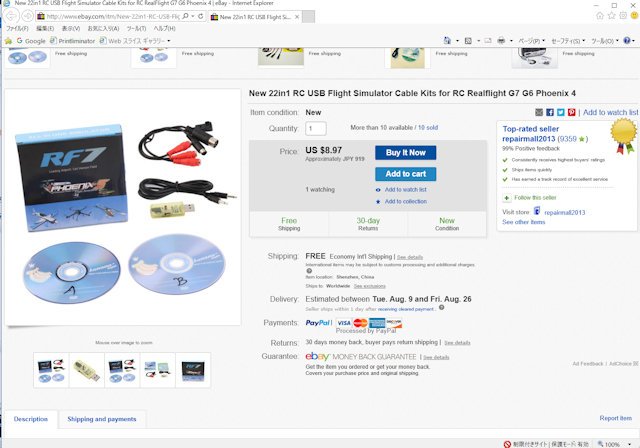 JUGEMテーマ:ラジコン この前、ebayをふらついておりますと以下の何やら怪しげな物を見つけました。 ラジコンsimです。フリーのFMSなどは有名ですが、コイツがけしからんのは、Realflight7, Phoenix4とタイトルに有った事です。しかし実際に入っているPhoenixはVer5だって事でした。 しかも値段が1000円前後じゃねーか、( ̄□ ̄;) ( ̄0 ̄;)( ̄Σ ̄;)おいおい、有りえんわ。 コレ、アカンやつじゃないのか?いやアカンだろ、誰がどう考えても。 これは真実を確...