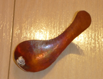 Tさんのところで茶さじをゲットです 銅板を激しく叩きまくって作るらしいです 絶妙の曲線です 茶さじの先っちょには銀のベルツノちゃんがおわします くい〜ん家の茶筒にはコンビニのプラスチックスプーンが 入ってたのでちょうどよかったです お茶っ葉に埋もれるベルツノちゃん